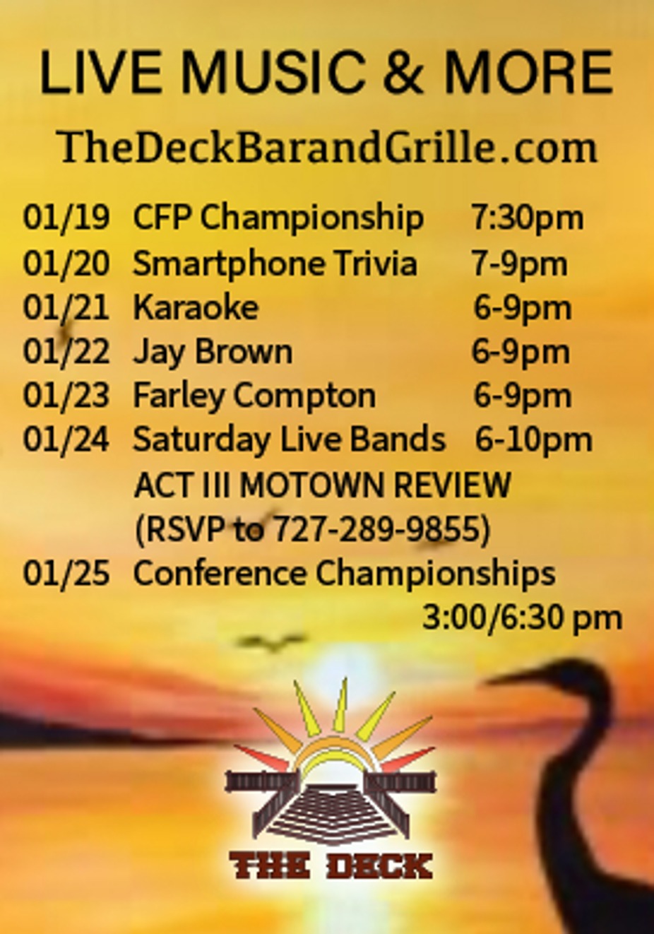 WEEK OF 01/19/26. We are MORE than your favorite Sports Bar. We consistently have some of the BEST food, cocktails, and entertainment in Tampa Bay from 11:30 -Close. Why go anywhere else? This is our mission!